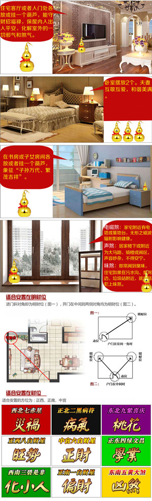 3)九宫飞星中的五黄星和二黑星等都和欠安有极大关系,它们五行都是属土。因为铜器有化解土煞的功效,所以在五黄、二黑星流年飞临方位挂上铜质的葫芦,对家人健康有一定的帮助。
