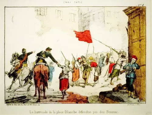 一副18世纪的版画,描述巴黎公社在“流血周”中的情景,高举的红色旗帜是他们的国旗