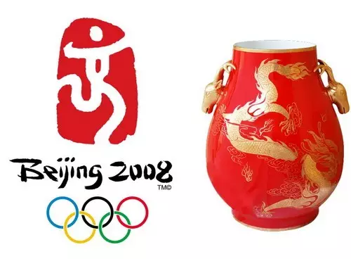 北京奥运红色会徽和同时发行的中国红奥运礼品瓷