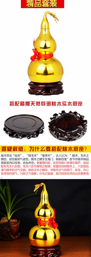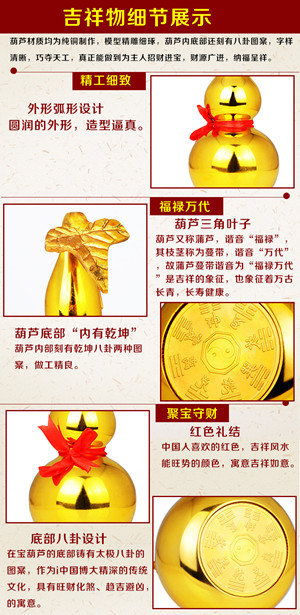 2、守财聚富,葫芦谐音“福禄”,加上它的外形圆滚有曲线,看来相当福气,加上入口小、肚量大的特色,仿佛能够广吸金银珠宝,且不易外流。因此在财位上摆放或悬挂铜葫芦,有助于守财聚富。