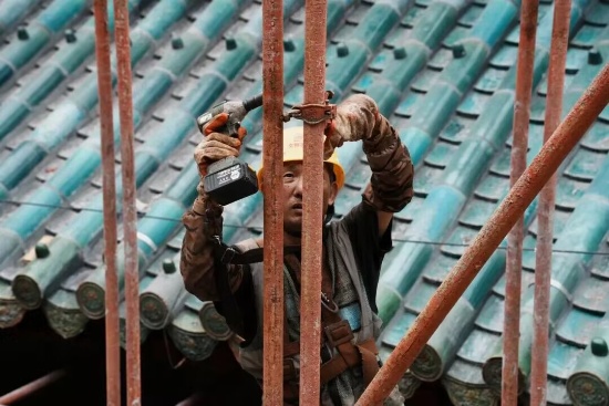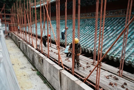 9月10日上午,记者在修缮项目现场看到,工人师傅正在分区域对脚手架进行拆除,同时对瓦件清洗。据施工方介绍,脚手架拆除工作从9月1号开始启动,目前已经拆除了总量的50%左右。按照施工方案,整个拆除工作预计到9月20号左右结束,同时还将对施工现场的物料、环境卫生进行清理,月底可以满足对外开放条件。